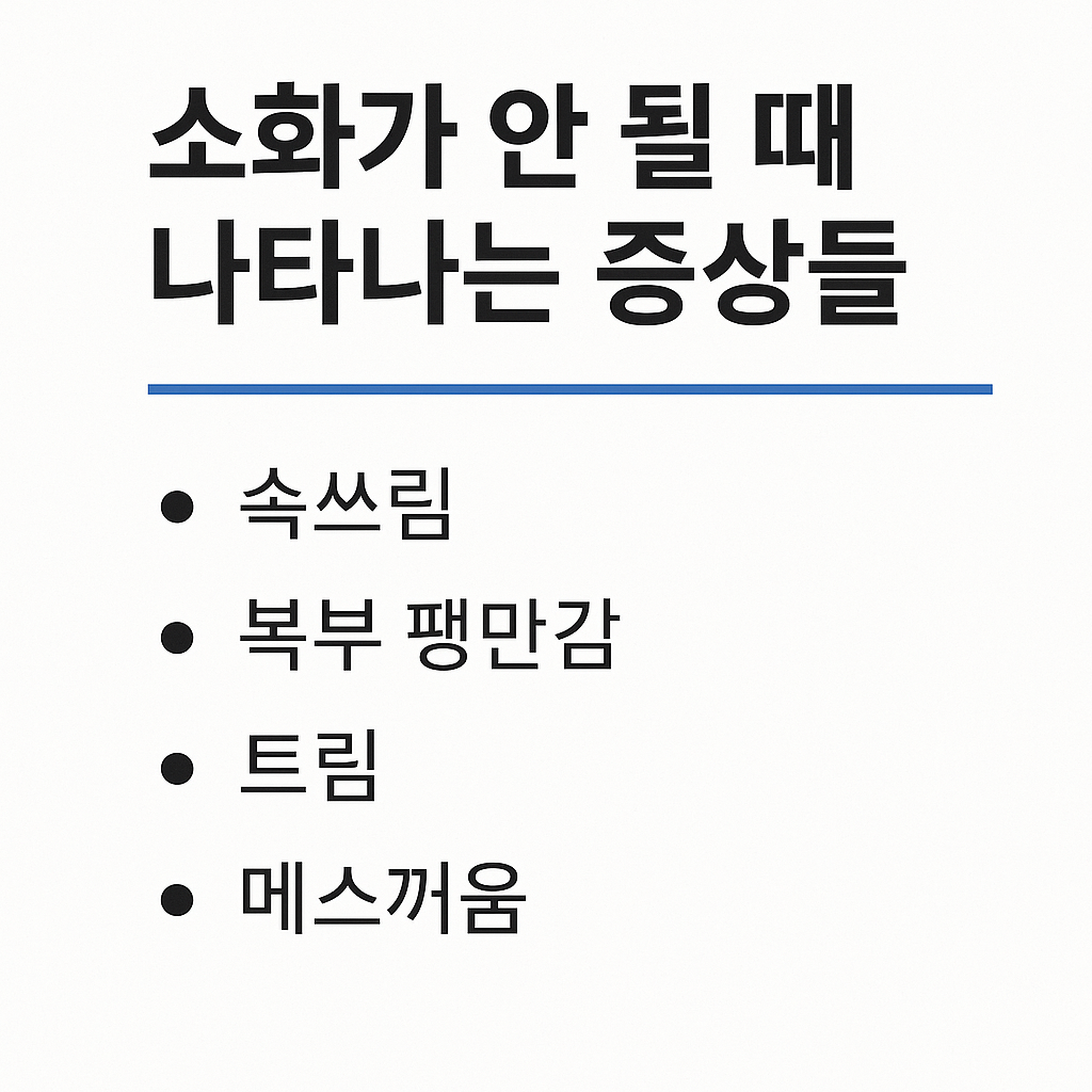 저는 소화가 안 될 때마다 뱃속이 빵빵하게 부풀고 머리가 멍해지더라고요. 이런 증상들, 의외로 많은 분들이 공감하실 거예요. 다음은 대표적인 증상 리스트입니다.
