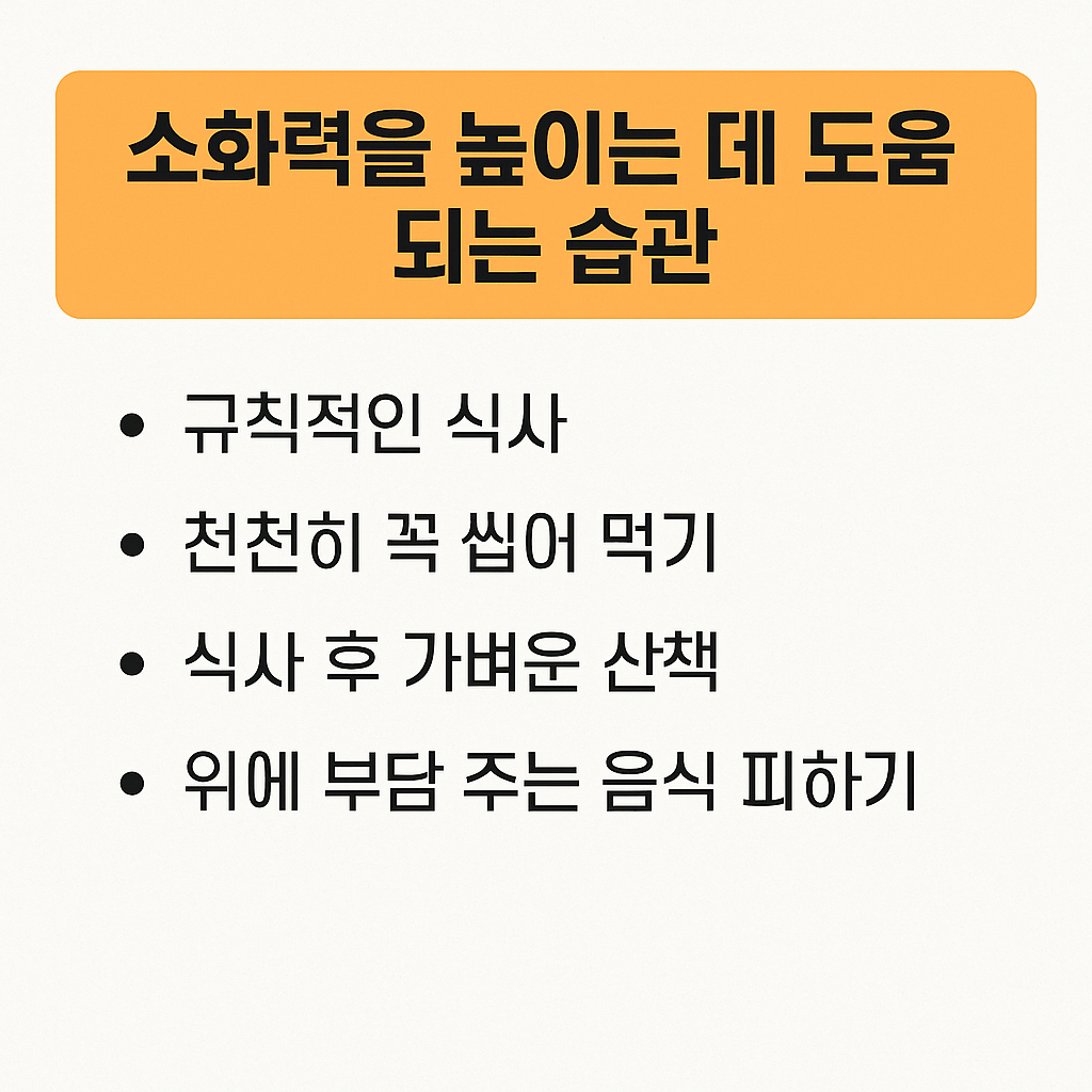 생활 습관을 개선하면 소화력도 좋아질 수 있어요. 예를 들어 일정한 시간에 식사하고, 유산균이 풍부한 식품을 먹고, 물을 충분히 마시는 것이 도움이 돼요.