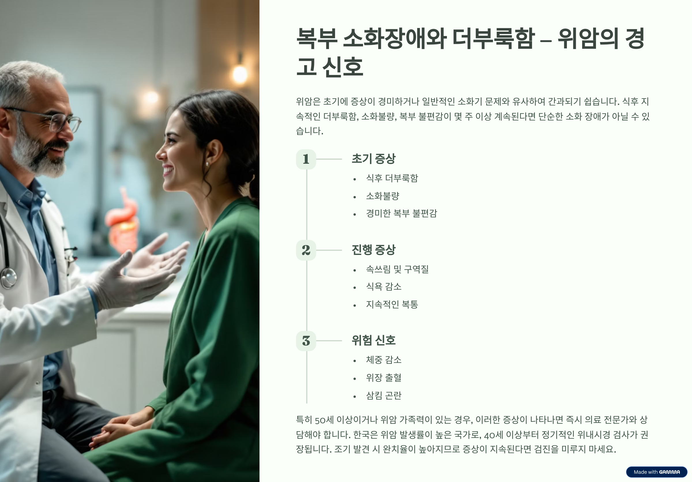 특이 자극 없이 속이 더부룩하고 위장이 더부룩한 증상이 이어질 경우 위암 가능성을 고려해봐야 합니다. 위암은 초기에 복부 관련 통증 없이도 복부 불쾌감을 유발하는 경우가 많기 때문에 의심을 거둘 수 없습니다.