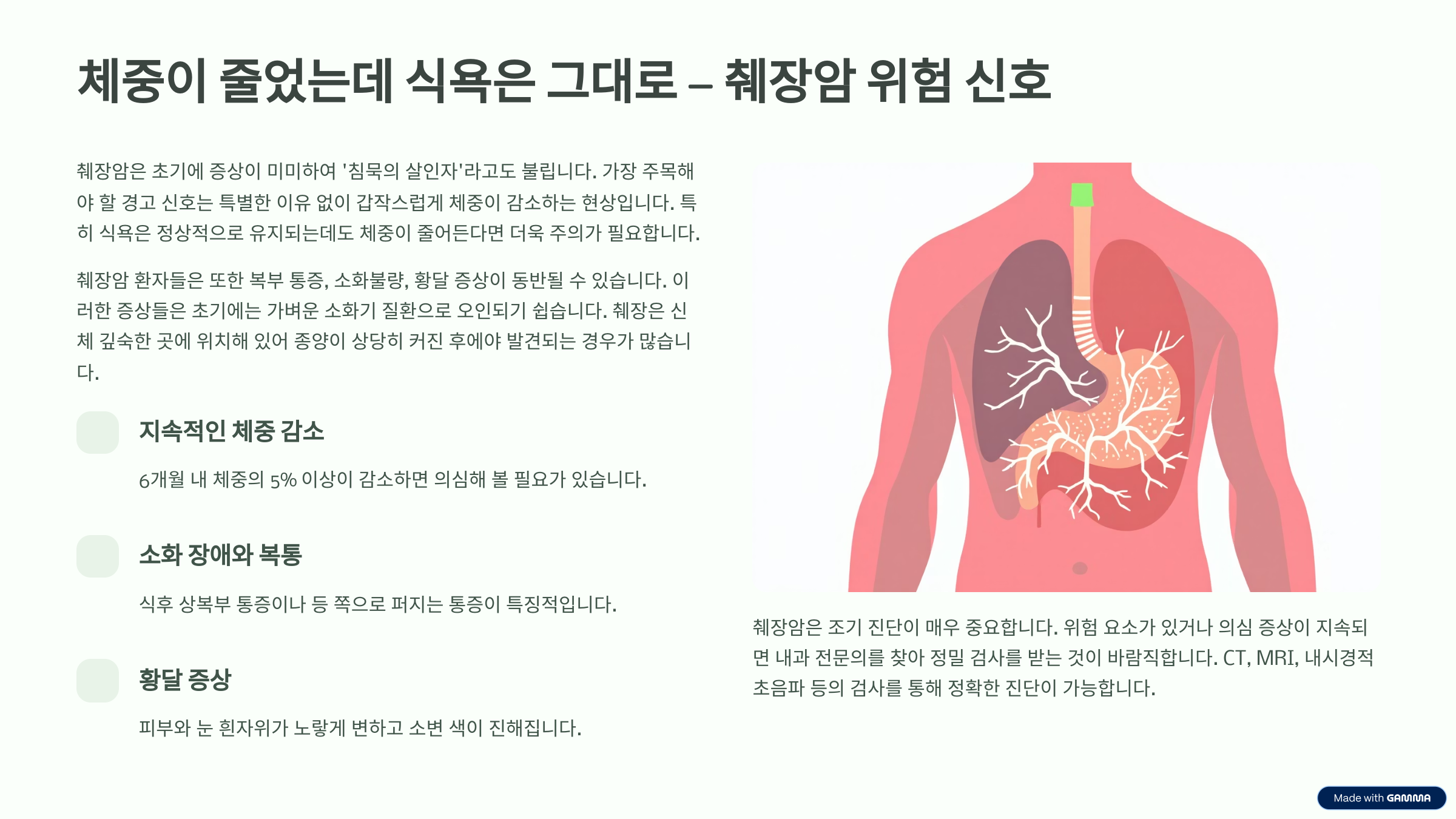 체중감, 피로, 위암, 대장암 등에서 공통적으로 나타나는 초기 징후를 살펴봅니다.