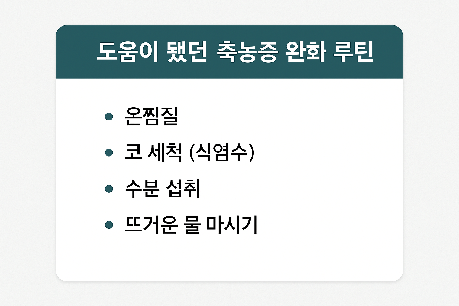 | 수분 섭취 | 수분을 충분히 섭취하면 콧물이 묽어져 배출이 쉬워짐 |
