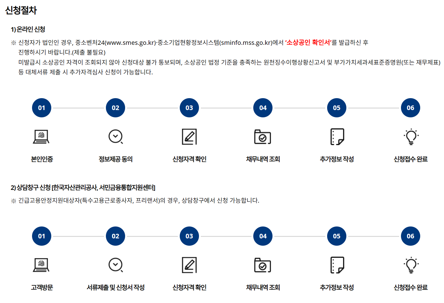 | 3단계 | 서류 제출 및 신청 → 상담 후 안내받은 서류를 제출하면 신청 완료 → 심사 후 결과에 따라 구체적인 지원 조건 확정 |
